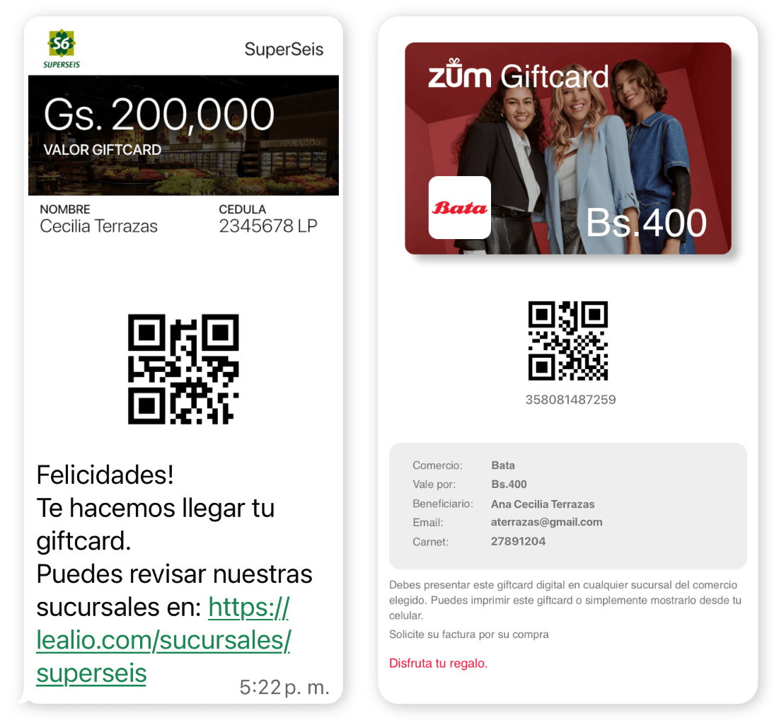 - Envío de giftcards digitales via correo electrónico o Whatsapp