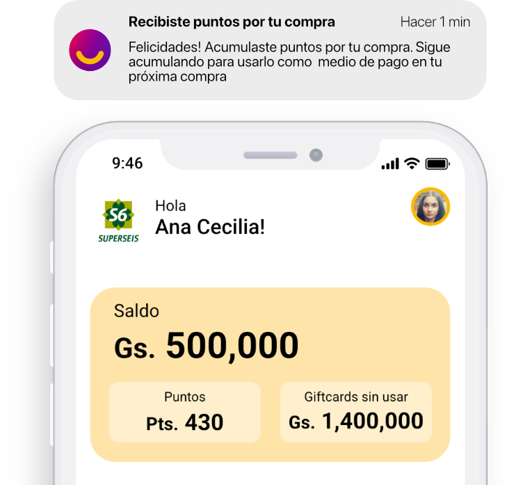 Tu cliente recibe una notificación push por los puntos que acumuló en su última compra. La Wallet puede personalizarse con tu logotipo.